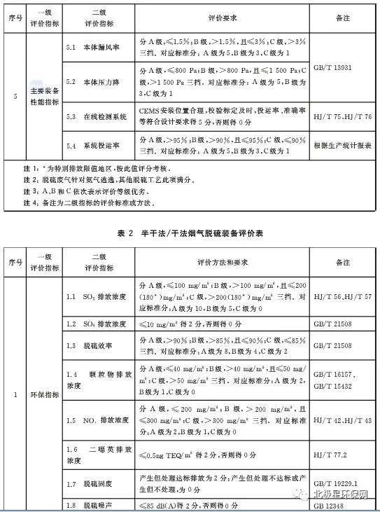 日前,中華人民共和國國家質(zhì)量監(jiān)督檢驗檢疫總局、中國國家標準化管理委員會發(fā)布《鋼鐵燒結煙氣脫硫除塵裝備運行效果評價技術要求GB/T 34607-2017  》。根據(jù)標準要求,鋼鐵燒結煙氣脫硫除塵裝備運行效果評價總分為100分,其中:脫硫裝備包括環(huán)保性能評價30分,技術經(jīng)濟評價15分,資源和能源消耗評價25分、生產(chǎn)管理評價10分和主要裝備性能評價20分;除塵裝備包括環(huán)保性能評價40分,生產(chǎn)管理評價20分和主要裝備性能評價40分。濕法脫硫性能指標包括SO2排放濃度、SO3排放濃度、脫硫效率、霧滴濃度、顆粒物排放濃度、NOx濃度、二惡英濃度等,詳見表1。半干法/干法脫硫性能指標包括SO2排放濃度、SO3排放濃度、脫硫效率、顆粒物排放濃度、NOx濃度、二惡英濃度等,詳見表2。電除塵、袋除塵主要性能指標包括顆粒物濃度、去除率、本體漏風率、壓力降等,詳見表3、4。